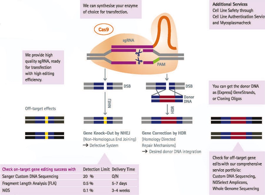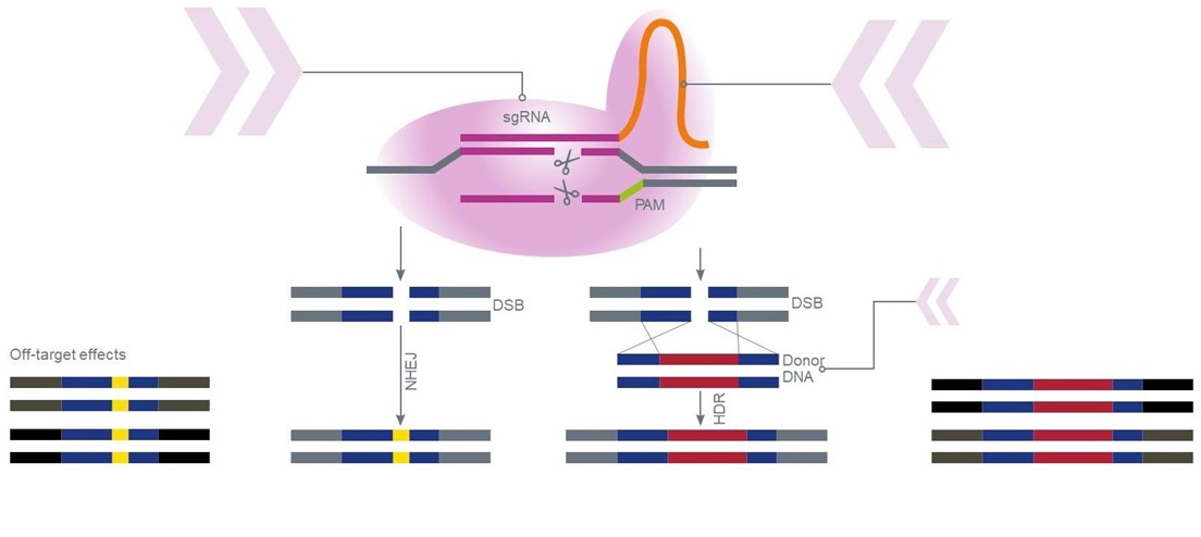 Knock-In by HDR: Providing the cell with a donor DNA, homologous to the sequences up- and downstream of the target region, the double-strand break may be repaired by the homology directed repair mechanism. In this case, the donor DNA integrates at the site of the double-strand break into the genomic sequence.