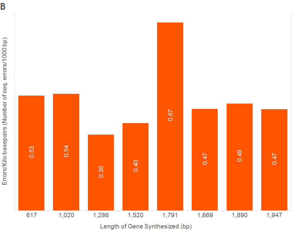In summary, these results indicate that nearly 50% of the clones harbor a DNA of the correct size and 1 error is observed for a sequence lenght of 2,000 bp (the sequencing errors are further reduced when error-removal methods are used during gene assembly).