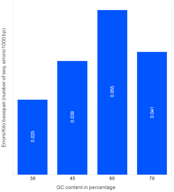 Morever, our studies reveal that the number of sequence errors does not vary significantly based on the GC content of the assembled target sequence. The genes in the study below were assembled using PCR assembly with high-fidelity enzymes. Subsequently, error removal methods were used.