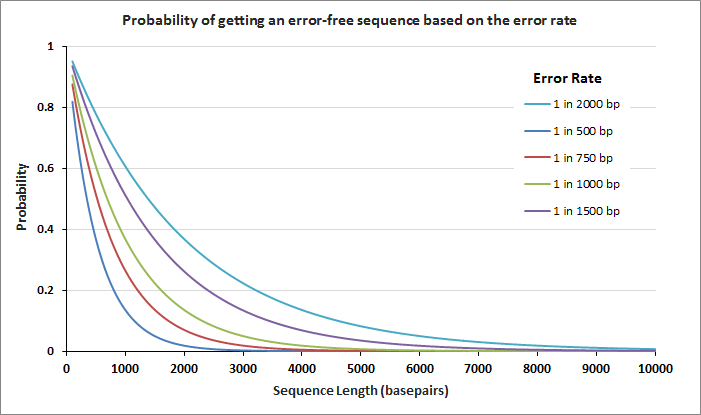 Genes are now more frequently assembled using chemically synthesized, overlapping oligonucleotides. The overlapping oligonucleotides are ligated, extended, or 'filled' to create larger constructs or even genomes. Owing to mistakes in chemical synthesis and subsequent enzyme-based assembly processes, the assembled genes unavoidably contain errors. The average rate of the errors attributed to chemical synthesis typically range from 1 to 10 errors per kilobase pair of assembled DNA. The following graph on the left displays the theoretical probability of finding an error-free gene of different lengths at a given error rate.