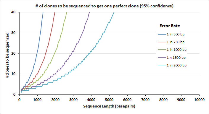 After gene assembly, cloning and subsequent sequencing of the isolated DNA from multiple clones allows a researcher to identify the clone(s) with the correct sequence. The number of clones that need to be sequenced to identify the one perfect clone also depends on the error rate; the graph on the right displays the number of clones that need to be sequenced (at 95% confidence level) before the 'one' is found. Clearly, the number of clones that need to be sequenced is fewer when the clones are assembled using the lower error rate oligos.