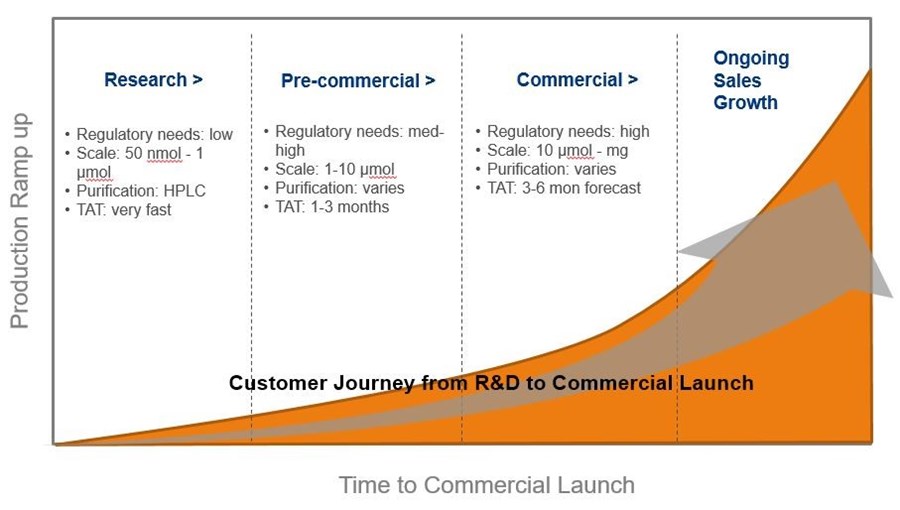 The commercialization process is shown below. It begins with research and ends with the commercial launch of a product. Each phase has different needs, which Eurofins Genomics is prepared to deliver on. For instance, the research phase typically involves smaller orders with experimental sequence designs. The sequences can sometimes be challenging and exciting to work on. Meanwhile, the commercial phase involves ramping up to larger amounts of material while ensuring quality never diminishes.